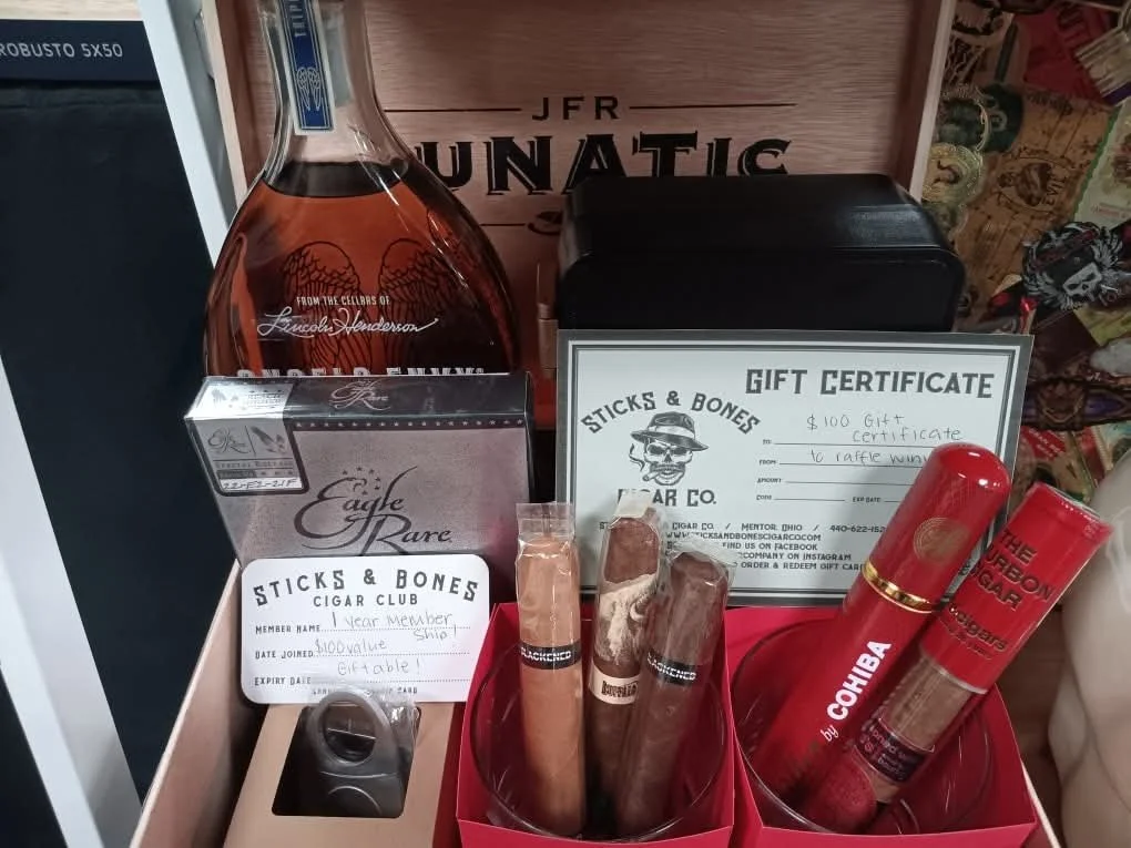 Gift basket includes: $100 gift card for Sticks & Bones Cigar Co., 1 year membership to Sticks & Bones Cigar Club, 750ml bottle of Angel’s Envy triple oaked bourbon, travel humidor, cigar cutter, torch, pair of Sticks & Bones rocks glasses, 11 whiskey infused cigars including an Eagle Rare 5 pack, Buffalo Trace, Wellers, E.H. Taylor, Makers MarkBlackened whiskey